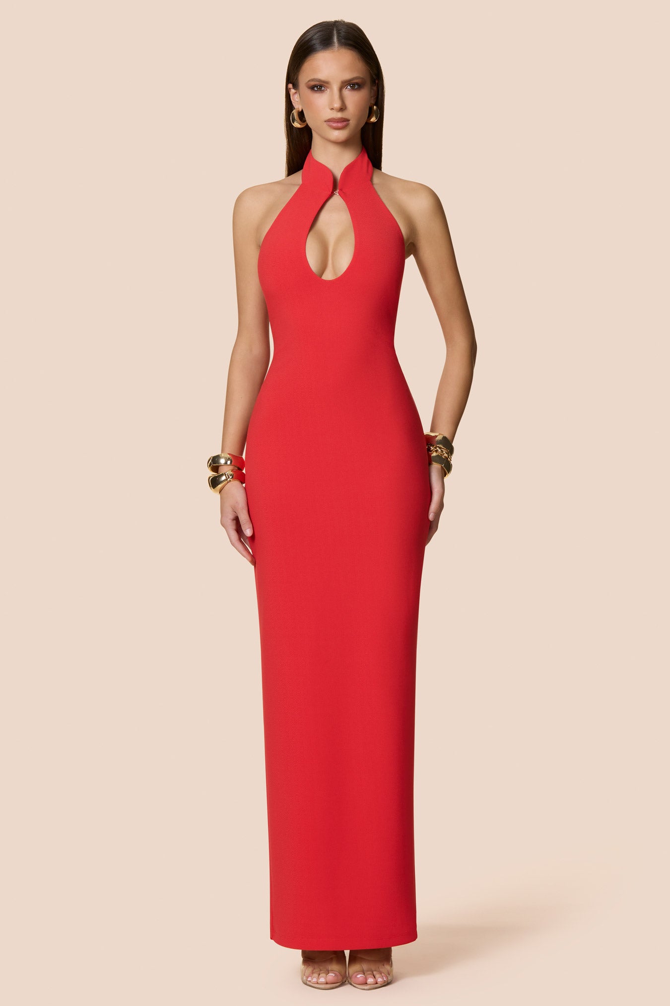 Stunning halter ankle length gown with opening at bust and hook and closure at front neck. It features a sleek mandarin collar for a classic silhouette. Invisible zip closure at back and split at back hem. Crafted in our signature bonded crepe fabrication, fully lined.