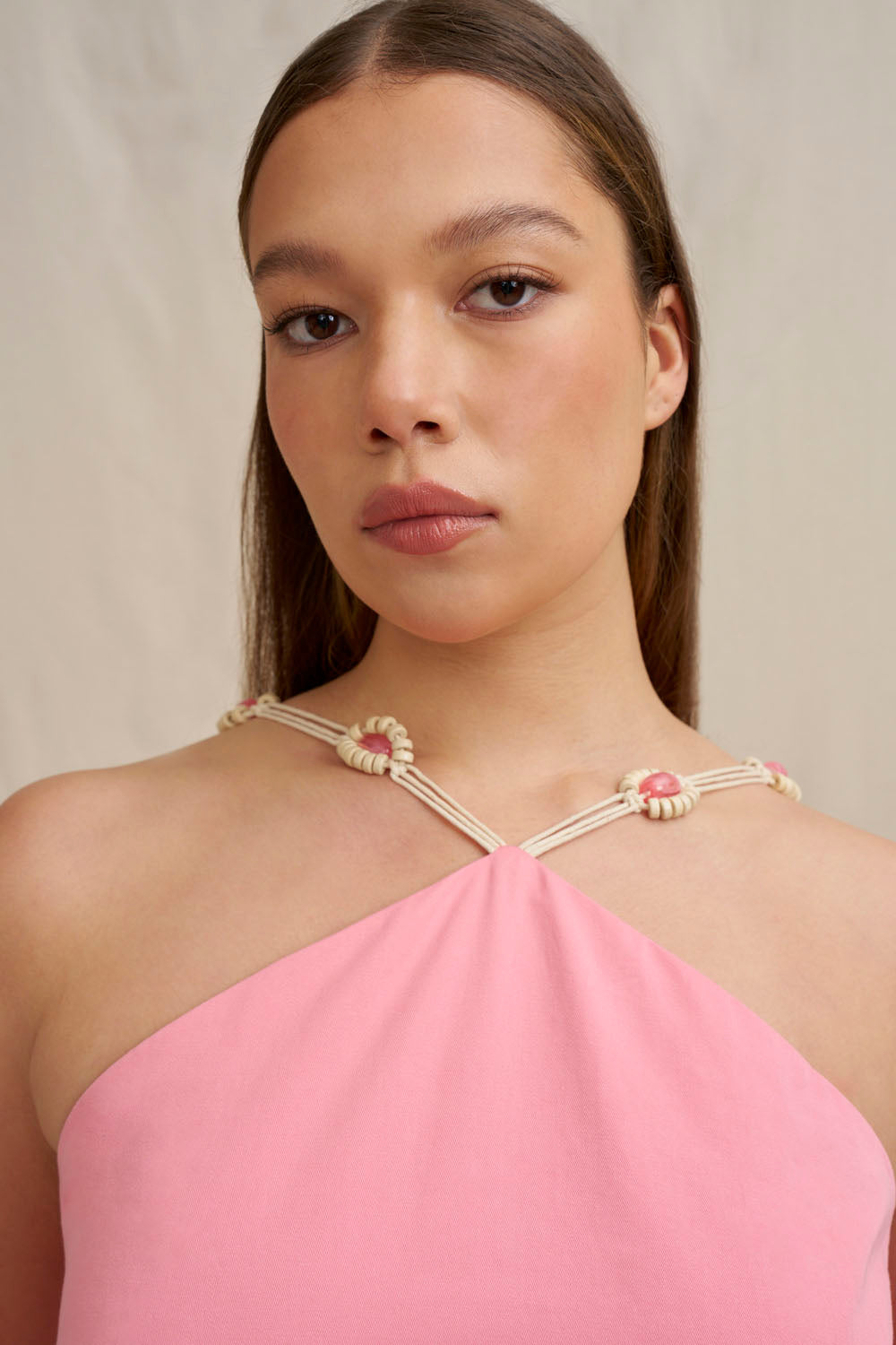 Crafted from mid-weight cotton drill with a subtle twill texture, the Verona Mini Dress combines structure with playful detailing. A dramatic rope-trimmed frill sweeps across the front and wraps around the hem, adding movement and visual interest. Handwoven straps are finished with custom-dyed beads, giving the dress a unique, artisanal touch - perfect for a standout, effortlessly chic look.